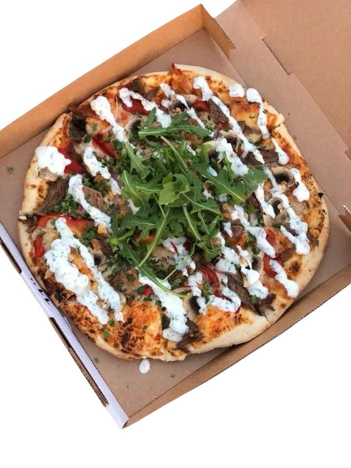Mozzarella, Prosciutto, Onion, Feta & Rocket